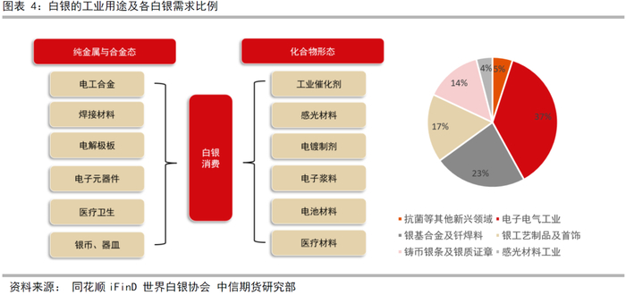 根据世界白银协会报告显示,白银的工业用途约占自身需求的50%以上,这点与黄金有明显差异(图表4),其被广泛的应用于电子器件、光伏、医疗卫生及工业生产领域。