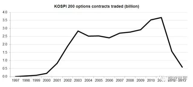 进入21世纪以后,韩国的股指期权交易量便稳居全球首位,一直要到2013年被印度超越,才让出占据了十年的榜首位置。在此期间的2002年、2003年、2004年,其成交量甚至超过全球股指期权成交量的80%。