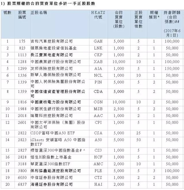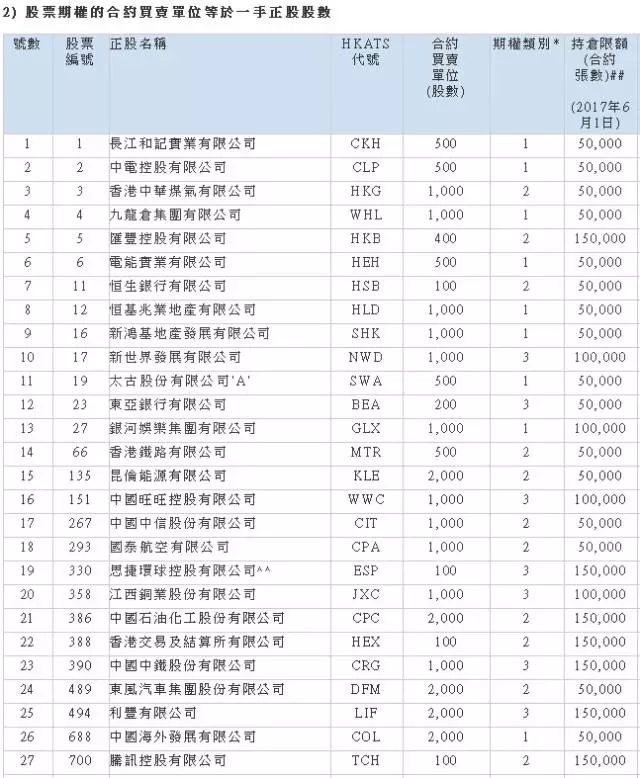 港交所股票期权合约(部分),详见: