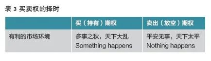 在这个基础上,读者应该有概念何时买期权,在什么情况下卖出期权,如表3所示。