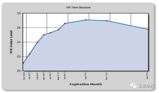 为什么差别会这么大?这个是因为VIX期货的曲线结构。一般来说VIX期货的曲线都是类似下图的形态,即远期的期货价格通常都要比近期的高,近期比VIX指数高。