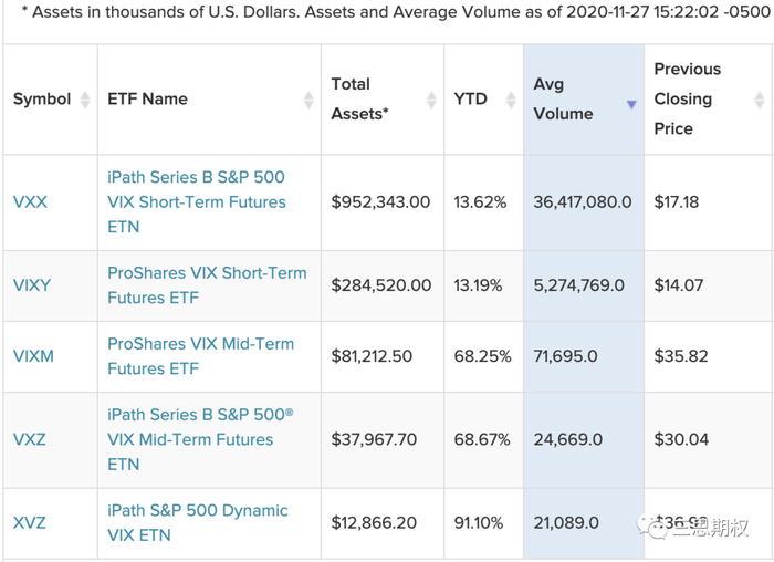 由于VIX是指数不能直接交易,市场上就有了VIX期货,VIX指数期权和VIX相关的ETF和ETN来供投机者投机和对冲。VIX指数的计算方法,VIX期货的运作方法都属于散户能接触到的产品中最复杂的一种,我们就不过多阐述其中的细节了。下图里列出了方便我们散户可以交易的VIX相关的产品。