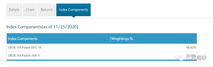 而VXX通过持有近月以及次月两个月的VIX期货来合成出一个30天到期(constant maturity)的VIX的期货价格。所以买VXX就相当于买了VIX前两个月的期货合约,但近月和次月的合约的比例不是1比1,简单的说是一个随时间的变化而变化的比例,比重由第一月逐渐转移到第二月。比如现在是80/20,明天是78/22,后天是76/24依此类推。下图为11月25日VXX的持仓比例:
