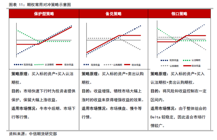 期权常用对冲方式有保护型、备兑型和领口型策略。其中保护型策略适合市场出现较大跌幅的情况,其最大特点是在大跌时对冲下跌风险,同时在上涨时保留标的大幅上涨收益。备对型策略适合市场震荡时进行收益增强。领口策略对冲和股指期货对冲可形成一定的替代。