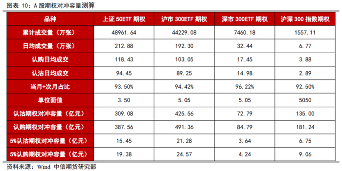 通过上文内容,我们知道期权的流动性主要集中在当月合约和次月合约,两者流动性占全市场的90%以上,因此本部分市场容量测算基于当月和次月合约。