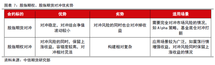 若想对冲风险的同时保留收益,则股指期货对冲在一定程度上仍需较好的择时能力。期货对冲能够解决我们前面提到的“减仓”问题。其最大优势在于能够较“完美”的对冲下跌风险,保持净值的稳定。但若想在对冲风险的同时保留上涨收益,则仍需要较强的择时能力。当市场大幅下行时,由于期货的价格变化和现货呈现较强的相关性,因此做空期货能够很好的对冲下跌风险。但由于期货的收益也是线性收益,若不做择时,简单卖空期货对冲风险,则当市场上行时,收益也会被对冲掉。所以,期货对冲更适合于希望完全对冲掉市场风险的场景,如风险中性产品,基金打新的底仓对冲。