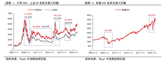 A股波动远高于美股。我们通过对比近15年上证50、沪深300与标普500指数的走势可以明显看到,标普500在最近15年走势相对比较平稳,而A股则呈现两个特点:1)牛熊切换迅速;2)涨跌幅度大。我们从图1和图2中可以看出,在2005年-2020年期间,A股经历了大约4轮左右的牛熊切换,平均一轮牛熊周期约为4年。而标普500在此期大约经历了一轮的牛熊周期,如果我们将时间线拉长至2000年,可以发现在近20年的时间中,美股大约经历了2轮牛熊切换,平均切换时间约为10年左右。因此从切换速度来看,A股牛熊切换明显更快。此外,从近15年的最大回撤来看,A股在每次牛熊周期中,最大回撤均较大,其中最大一次达到72.30%,而标普500近15年的最大回撤为56.78%。