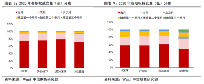 从成交量角度,我国期权市场流动性集中在当月合约。从各股票期权品种分月份成交量分布中,当月合约基本占据了超过70%的成交量,远月合约成交量较低,占比低于10%,流动性较差。虽然股指期权合约月份数量更多,同时股指期权在上市初期有较严格的日内交易限额制度,因此相比其他期权流动性分布较均匀。但随着股指期权交易限制的放开,其成交分布也呈现出趋向当月合约的趋势。