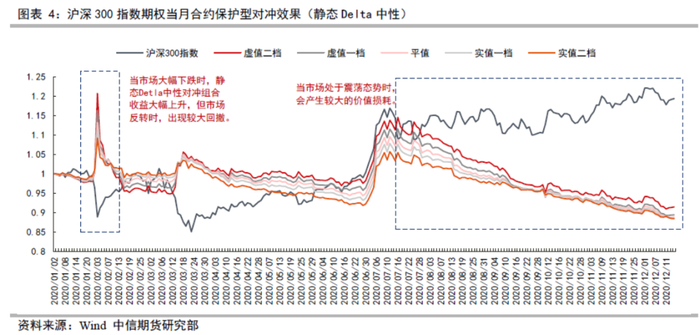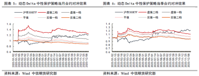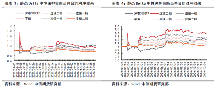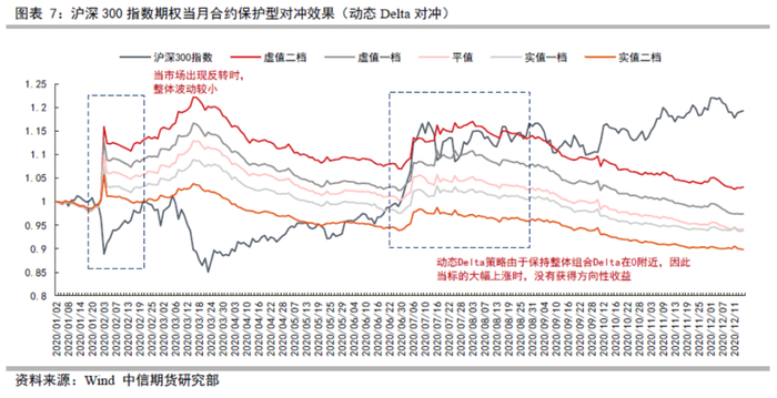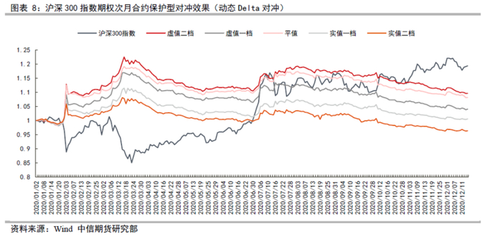 虚值合约对冲波动相较实值更大。从不同虚实值程度的合约对冲效果来看,由于虚值期权的Delta较小,因此若要使整个组合Delta为0,则在建仓时需要购买更多的期权合约。当市场大幅下跌时,虚值合约的组合的Delta值会更小(绝对值更大),因此整个组合的波动会更大。