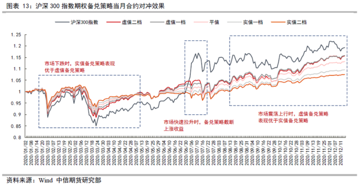 2)市场下跌时实值值备兑策略表现更好,市场震荡上行时则虚值备兑策略表现更好。