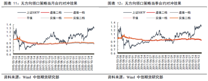 无方向性领口策略对冲效果稳定,类似股指期货对冲。在构建领口策略时,如果选择的认购期权行权价格与认沽期权行权价相同,此时相当于利用认购和认沽期权合成了现货的空头,因此该种策略没有留方向性敞口,这里我们称作无方向性领口策略。该种对冲方式类似于股指期货空头。从回测结果来看,无方向性敞口策略具有非常好的对冲效果,整体的对冲效果类似股指期货对冲,因此两者具有一定的替代性。