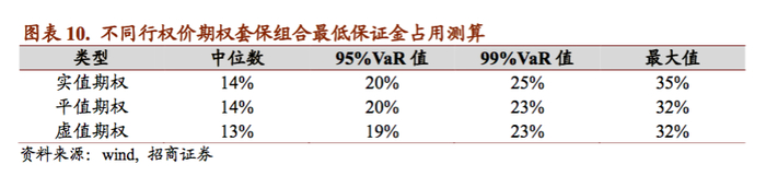 另外从组合保值金的占用比例来看,如果选择实值期权平均和极端情形下的保证金占用可能相对平值和虚值期权的占用更高。