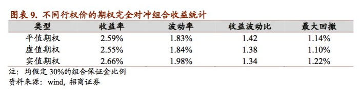 与股指期货不同,在同一到期日下有多个期权对组合可以提供给投资者设计套期保值方案,因此我们尝试比较了选择不同期权行权价下,期权套期保值效果的差异,从下表的统计结果来看,选择平值、虚值一档期权和实值一档期权对组合,对冲组合的业绩影响没有收到很大的影响。