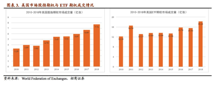 跟国内市场类似,股指期权和ETF期权对应的名义本金并不相同,且存在较大差异,所以通过观察期权的成交量无法直接对期权市场的占比进行比较。不过根据FIA数据的统计,2008年标普500股指期权(SPX)的成交量为3.71亿张,SPDR标普500ETF期权的成交量为8.35亿张,该数据有较强的代表性。类似的,股指期权的合约乘数为$100,以标普500的指数点为3000点计算,其合约面值为$300000;ETF期权合约单位为100,据CBOE数据,SPDR的净值约为标普500指数的1/10,则一份合约面值约为$30000,约为股指期权合约的1/10。因此,可以估算出2018年标普500股指期权的名义本金约为SPDR标普500ETF期权的4倍以上,因此大概率推算出美国市场股指期权交易规模显著大于ETF期权。