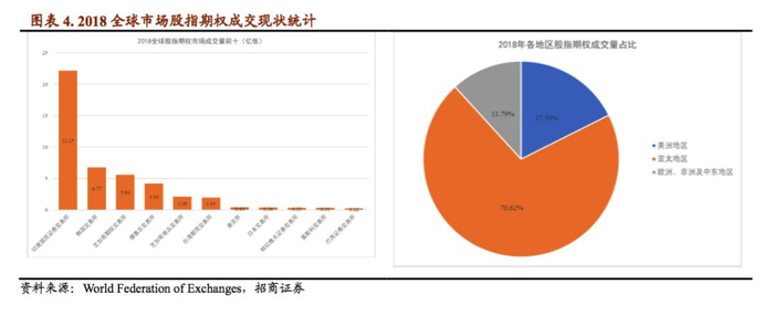 进一步的,我们对全球各地区的股指期权交易情况进行统计观察。根据WFE数据,在2018年全球股指期权市场成交量方面,印度市场占比遥遥领先,其中印度国民证券交易所成交量为22.15亿张,其次为韩国交易所和芝加哥期权交易所,成交量分别为6.77亿张和6.60亿张。印度国民证券交易所成立于1992年,并于2000年推出了期权和期货交易。