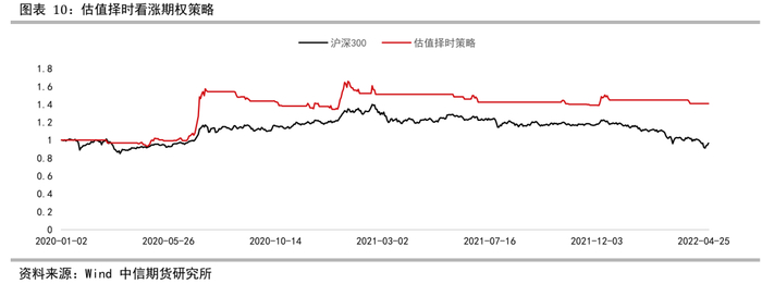 策略点评:策略表现有效,在行情下行阶段得以控制仓位,但是另一方面,对波动率择时可能会牺牲上涨中期隐含波动率同步走高时的多头收益。