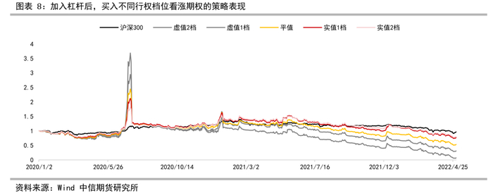 根据回测结果发现,如果将杠杆考量进买入看涨期权的策略收益中,买入虚值期权确实可以在牛市赚取更高收益,但在熊市也会相应承担更高回撤。另外若考虑杠杆,策略回测净值走势整体波动过大。