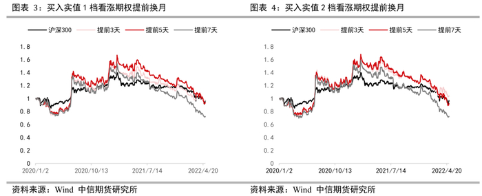 根据测算结果,我们得到结论:买入看涨期权提前5天换月最佳。对此我们做出两点说明:第一,平值附近的gamma一般会在到期前快速升高,因此不宜过早移仓;第二,期权买方的时间价值会在到期前快速衰退,因此不宜过晚移仓。综合来看,合理的移仓换月会对买入看涨期权策略表现有所提升,提前5天换月最佳。