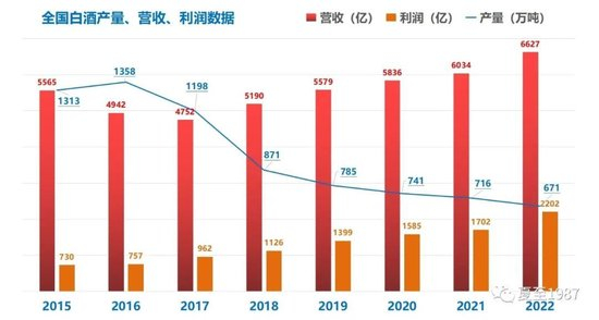 先看一组数据,统计2015年以来全国白酒行业的总产量(下图蓝线,单位万千升)、总营收和利润(下图柱状图,单位亿):