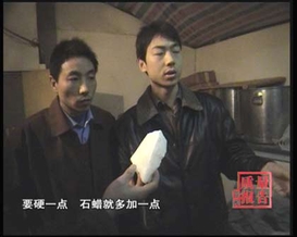 他告诉记者,火锅底料里加的所谓凝固剂其实就是石蜡。刚才还矢口否认添加了凝固剂的老板,这时也只得说出了实情。