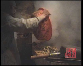(空镜工人把白色物体扔进烧开的牛油中)