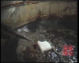 随后,记者又来到重庆市江北区家厨食品厂。这是重庆市一家中等规模的火锅底料厂。记者在炒制车间里,同样见到了融化的牛油里浸泡着包装用的石蜡。(空镜)