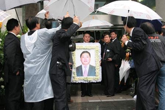 遗像旁悬挂的挽联是:忆当年胆大包天名震四海成改革英雄,看今朝英年早逝声憾神州得百年美誉。词句虽不工整出奇,却也属实。中间那张英姿勃发的巨大遗像让人看了心惊。