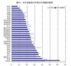 全部29 个行业的样本公司05 年的预测动态PE 水平为15.31 倍,和04年动态PE 水平17.68 倍相比较出现较大的下降,不仅整体投资价值继续得到提高,而且有较多的行业体现出较好的绝对投资价值。(图12)