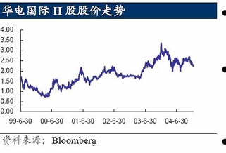 将上述三种方法的估值综合考虑后,我们得出华电国际的合理每股价值为2.70 至2.85 元人民币,相当于14.5-15.3 倍2005年预期市盈率。