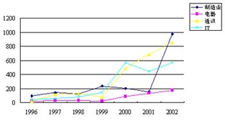 图1 1996年到2002年各行业外资企业离职人数的变化趋势