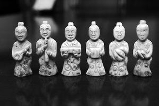 根据其雕刻手法,吴教授和康先生都认为这是一套汉代的玉乐俑。每个玉乐俑手中握有一件乐器,且各不相同。初步识别,有一件琵琶、一件古琴,还有一件竖笛。另外还有3件乐器的外部特征不明显,但都是打击乐器。