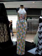 另一套菲拉格慕晚礼服则用数百个一平方厘米大小的镜子和数以万计银色小圆片串成的菱形图案为主图案。在1.5平方厘米的一个菱形图案内,有超过150个小圆片。整条晚礼服要串多少小圆片,恐怕只有设计师和制作者清楚了。
