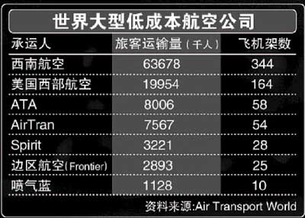 目前,国际上运营比较良好的“低成本航空公司”有美国的西南航空公司和喷气蓝航空公司、马来西亚的亚洲航空公司、澳大利亚维珍航空公司等20多家。其突出的特点是成本低、票价低、服务简化。以美国西南航空公司为例,这家航空公司为了和对手竞争,采取的就是以下策略:采用单一的B737机型;提高飞机的使用率以增加航班密度;实现点到点的中短途国内航线,没有联运服务;使用次级机场;保持精简的人机比;限量餐食供应;可靠的离港率与快速过站等。