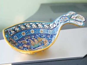 卡克图其实是中蒙边境上一个小镇的名字,这种工艺品也是清朝时从俄罗斯传入中国的,是中国传统花丝镶嵌工艺中的另类,它在俄罗斯的学名是俄罗斯烧瓷。马佩坚介绍,由于卡克图的花饰图案带有浓厚的西方色彩,容易被国外人接受,所以他的作坊才能够赢得出口订单,而其他几个制作中国传统花丝镶嵌工艺品的作坊,目前在经营上都比较艰辛。