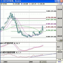 CBOT玉米连续价格周线图来看,出现回调的技术面没有CBOT大豆强烈,但其日线图中RSI指标已经与价格出现背离,下调的压力较大。目前价格收于MA(5)线下方,在MA(10)线上方。RSI指标向下突破支撑线,则价格有望继续下调。根据回归模型的预测,按照目前美国农业部对2005/06年度玉米供需预测数据,可得CBOT玉米连续价格的价值区间应在190美分一线附近。