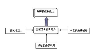 迄今为止,有关品牌资产理论的研究一直沿用大卫·艾格创建的框架,品牌实战中也是以这一理论为指导而展开。大卫·艾格的品牌资产理论认为,品牌资产包括品牌知名度、品质认可度、品牌联想、品牌忠诚度及品牌的法律资产。品牌溢价能力并未包括在内,品牌之所以能成为资产(有些企业把品牌资产列入资产负债表)无非是因为品牌能支持企业的赢利,品牌溢价能力是企业获得更高售价、更高利润率、更好赢利的有力武器,所以品牌溢价能力没有包括在品牌资产里是不合乎基本逻辑的。品牌支持企业赢利主要通过吸引消费者更多地购买品牌(即拥有较高的品牌忠诚度)及品牌麾下的产品即使与竞争品牌的产品在性能、技术、外观上基本接近也能卖出更高的价格(溢价能力)来实现。实际上,品牌资产中的知名度、品质认可度、品牌联想等指标最终通过提升忠诚度与溢价能力从而使品牌具有赢利能力。(如图)