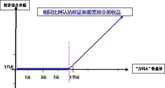 在这一投资组合中,如果“万科A”股价下跌,则由于权证的作用,投资组合的市值将会最低在3.73元,而如果股价上涨,则投资组合的市值也会得到提高。