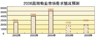 2004年高档商品房市场实际需求量约5000套左右,2005年随着上海市房地产市场整体的不景气,高档房也受到极大冲击。根据2005年前三季度高档房实际需求统计数据来看,2005年较2004年高档房需求萎缩2/3,约1700套。2006年需求有望缓慢复苏,达到1920套的水平。