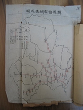 老话说,"敌人是不甘心灭亡的",就这么点儿地儿了,辉县的县政府还有"第三科",还忙着画了好些地图!这卷材料里一共有三十几幅图,包括辉县盘查哨所图,辉县公路电话图,中心寨联络碉楼图,集训第二、三总队进剿边区奸匪战斗图,还有手绘的辉县情报网构成图等等。这后一幅图里,敌人的情报网一直伸进了解放区内部,除了用颜色标出的情报联络线,还有情报组长和情报员所在的标记。(见图)