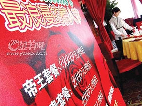 上图:2006年2月6日,郑州一高档饭店为迎接情人节,推出了分别标价99999、2999元、1999元、999元四个档次的情侣套餐。