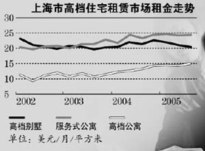 由于上海经济连续保持两位数的高速增长及跨国公司纷纷入驻,在2005年,以跨国公司外籍员工为主要客户群的服务式公寓租赁市场,入住率和租金报价都在历史的高位运行。