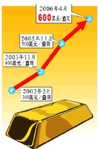 黄金价格从每盎司400美元涨到500美元,经历了从2003年11月到去年11月几乎2年的时间。而自过500美元整数关口后,价格飙升更快,短短5个月,就跃过600美元。