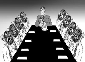 灯光昏暗的走廊里,几个服务生来回穿梭着。除了偶尔从大厅传来的欢声笑语,这里一片静寂。推开一扇虚掩着的门,走进去,同样昏暗的灯光下,16个形形色色的男女,围坐在一个巨大的长方桌前。每个人的面前放有一个长方形的身份牌。隐匿地浏览过面前的身份牌后,他们或悠闲地专注于面前的餐点,或四处张望打量着周围人的神情。