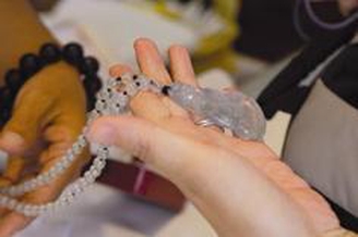 珠链和手镯是翡翠首饰中价位最高的两种,原因是这两种饰物对原料的要求最高:原料要大,颜色要均匀一致,不能有绺裂、杂质。一粒戒面达到这种要求都不容易,何况一大块翠料,所以极品的手镯、珠链价格多在千万元以上。