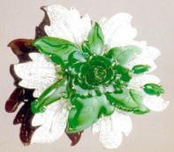 这套首饰组合在一起,放在特制的小盆中,就是一盆盛开的绿色玫瑰花,五朵花花瓣是颜色非常漂亮的翡翠,种份细腻,花心是一粒大钻,花叶由很多小钻石和白金组成;取下来,这五朵花就构成了一对耳环和三个别针,三个别针还能组合成一件大别针。这套首饰估价为260万-300万港币,最终以450万港币成交,加上佣金要到500万港币左右。