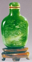 烟壶:翡翠烟壶是烟壶中比较特殊的品种,上好的原料配上上好的做工是能卖大价钱的。烟壶专场拍卖中常能看到压轴儿的翡翠烟壶。