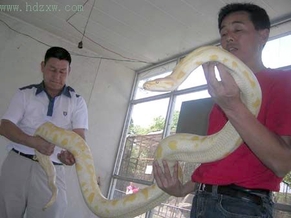 昨日凌晨4时许,接到110指挥中心转来的一个求助电话,林业局野生动植物保护管理站、东湖公园动物园专业人员赶到现场,看到一条4米多长的大蟒蛇蜷在房间里,与其他蟒蛇不同的是,蟒蛇身上的颜色黄白相间,漂亮极了。