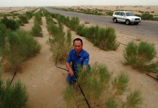 工人郝海峰正在新疆沙漠公路旁整理滴灌水管。为防止沙漠公路遭受风沙危害,在草方格机械防护的基础上,工作人员实施了以生物防护为主的沙漠公路生态防护林工程。本报记者 王旻 摄 三北防护林工程纵贯我国东北、华北、西北地区,东西绵延近5000公里,被誉为“绿色长城”。然而,现在这道“绿色长城”已有多处断档坍塌。