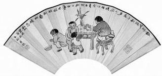 中秋节的意义,流传到现在,恐怕只有团圆最重要了。毕竟,月是故乡明,人还是要讲究个“狐死首丘”“落叶归根”的归属感。不过,在沈子丞的这件扇面《中秋团圆图并行书七言诗》里,倒更像是所谓的儿孙满堂,描绘了四个天真无邪的顽童,其中一个正跪坐在凳子上,用月饼搭桥玩耍。扇面上方有题诗一首,并注明为“慧兰属画”,钤印有:之淳书画等。这件作品,于2002年10月21日由上海崇源以8,250元拍出。