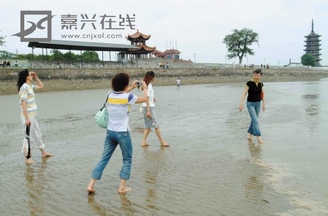 据此间《钱江晚报》昨天报道:前天,在盐官观潮胜地,占鳌塔以西沿江边四分之一的钱塘江江面被沙土涨满,约两公里,不少游客禁不住好奇,下到江面上的沙滩玩耍。